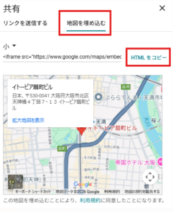 GoogleMapから実際に目的地をチェックした後、「共有」を選択し、「地図を埋め込む」タブを選択することで、iframeタグが表示されます。