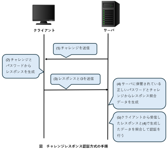 チャレンジレスポンス認証では、認証サーバから送られてくる文字列(チャレンジ)に対し、正しい計算結果(レスポンス)を返すことで認証する方法です。